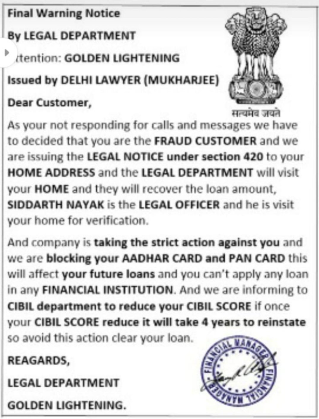 Pravin Kalaiselvan On Twitter If Any Customer Took Loan From Goldenlightening Finance And Received Legal Notice Please Dont Get Panic And Tensed Legal Notice Is Fake Thank You Operationhaftavasooli Https T Co 8hhsemhbbs Twitter